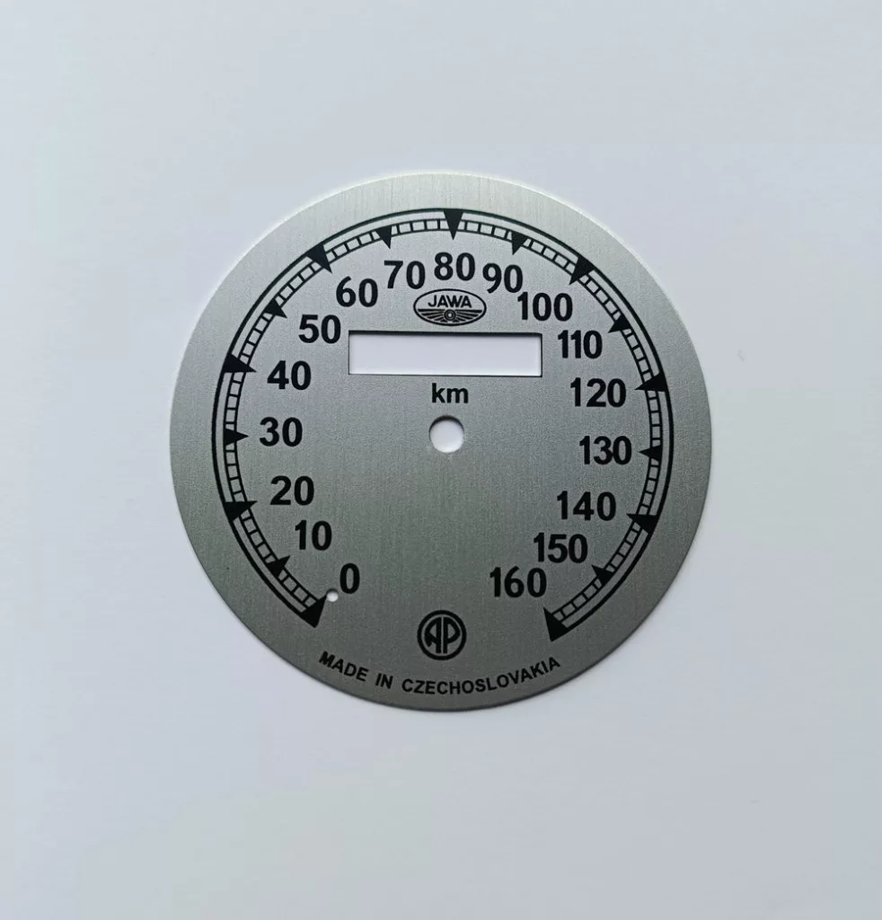 Sebességmérő számlap 0-160km/h, ezüst-fekete, Jawa 500 OHC 00,01